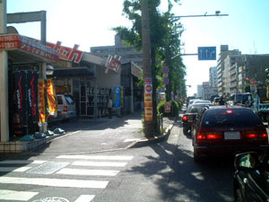 信号を過ぎますとガソリンスタンドさんの2軒となりに当店が見えてまいります。しかしここでは右折できませんのでいったん通り過ぎてくださいね。 次の信号で右折していただくので、この辺りで右車線へと移動しておいてください。 |