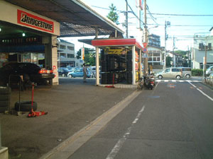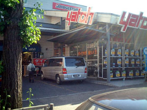 さあ、当店が見えてまいりました。 大量のタイヤが目印です。 |
