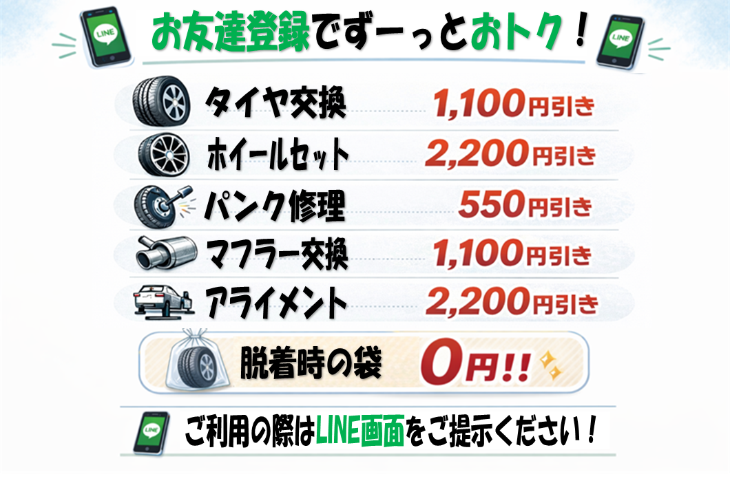 作業工賃はご購入のタイヤサイズ(インチ)等により異なりますので、 お気軽にお問い合わせください。